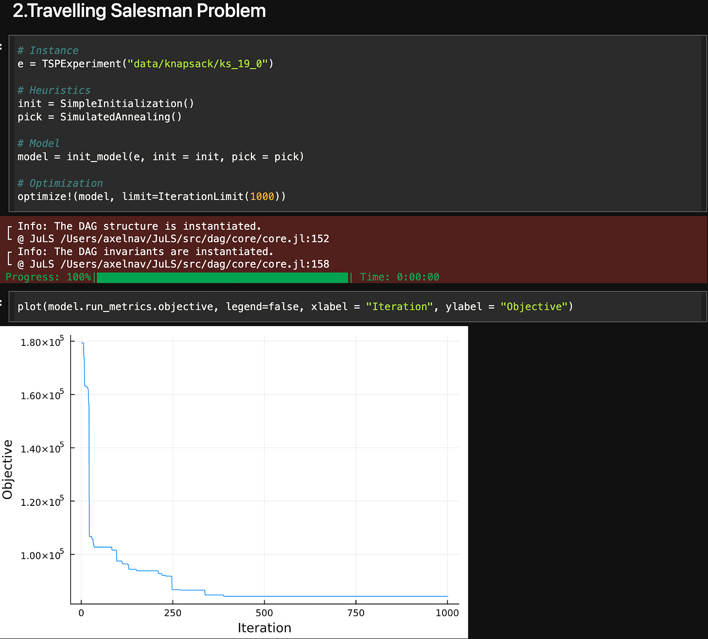 The following example from the project repo illustrates the steps for solving the famous Traveling Salesman Problem with a few lines of code: